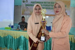 Ny Titin Barkah,Saat Menyerahkan Trofi Juara 2 Lomba Fashion Show Peringatan Hari Kartini Darma Wanita se Prov Sumsel, Kepada DWP Kankemenag Kota Pagar Alam Pada Pertemuan rutin bulanan