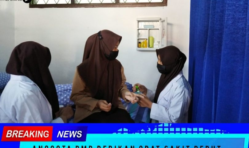 Anggota Palang Merah Remaja (PMR) sedang mengobati siswi yang bernama Dina Novitra yang mengalami sakit perut, dan langsung diobati oleh dua orang anggota PMR yang memberi pengobatan, Kamis (04/11)