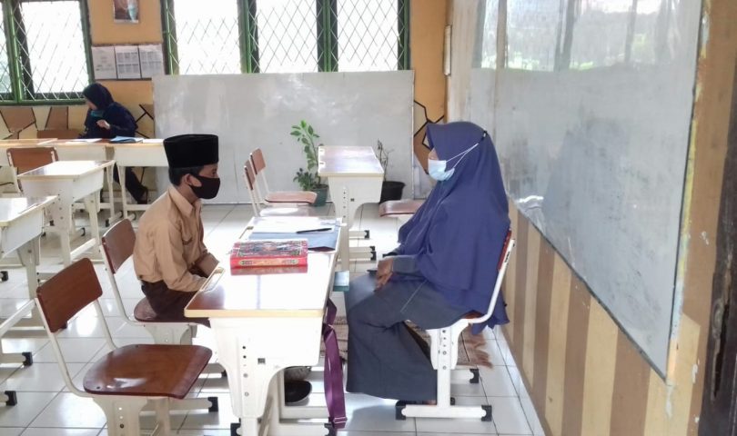 Dalam kegiatan tersebut Barkah, S.Pd dan Rita zahara, S.Pd di dampingi Kesumah Diana, S.Ag melakukan tes peserta didik baru di dalam dua ruangan kelas madrasah. calon siswa/siswi yang mengikuti tes di wajibkan memakai masker, mencuci tangan dan menjaga jarak. siswa/siswi yang dipersilakan masuk ke ruangan maksimal dua orang dan siswa/siswi sudah melaksanakan tes dipersilakan pulang untuk menghindari kerumunan di lingkungan madrasah.