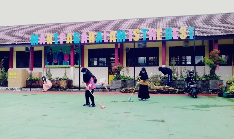 Siswa siswi Madrasah Aliyah Negeri 1 Pagaralam bergotong royong dalam melaksanakan tugas kebersihan lingkungan madrasah. Dimana terlihat siswa siswi telah melakukan kebersihan di lingkungan halaman madrasah, dan di depan kelas secara bersama-sama. Sabtu,(13/02)