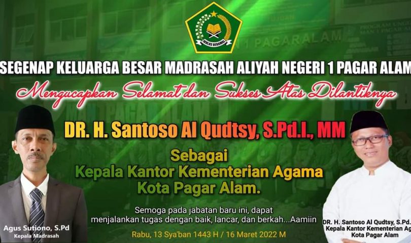Selanjutnya dalam kesempatan tersebut pula Ridi Efran Susilo selaku guru MAN 1 Pagar Alam juga mengucapkan selamat Kepada Kepala Kantor Kementerian Agama Kota Pagar Alam yang baru Bapak H. Santoso Al Qudtsy, semoga Kementrian Agama Kota Pagar Alam semakin maju.