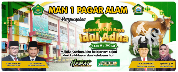 Selamat Hari Raya Idul Adha Kepada Seluru Dewan guru dan Pegawai MAN 1 Pagar Alam serta kepada seluruh siswa-siswi ,semoga kita semua dapat menjadi hamba-Nya yang senantiasa menjalankan semua perintah-Nya dengan hati yang Iklas guna menunjukkan rasa cinta dan taat kita kepada Allah SWT, dan selalu menjauhi semua larangan-Nya sesuai dengan kisah yang diceritakan pada kisah Nabi Ibrahim, AS.”Katanya
