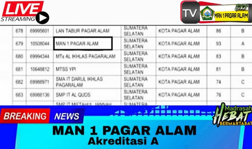 MAN 1 PAGAR ALAM berhasil meraih nilai 93 dengan peringkat Akreditasi A berdasarkan hasil pengumuman Penilaian Akreditasi BAN-S/M Pada Tanggal 27 Oktober 2021