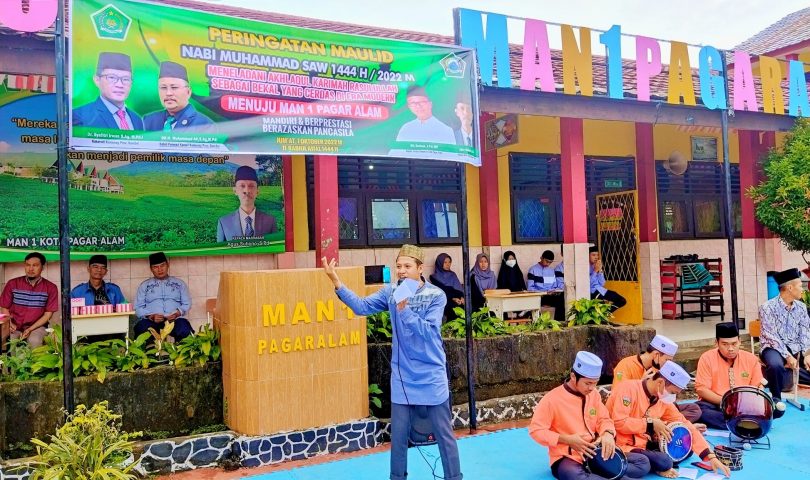 Siswa/siswi Madrasah Aliyah Negeri (MAN) 1 Pagar Alam menggelar Peringatan Maulid Nabi Muhammad Shalallaahu Alaihi Wassalaam dengan menampilkan sholawat Mahalul Qiyam, Kegiatan Peringatan Maulid Nabi Muhammad tersebut digelar di Lapangan Madrasah Jum’at (7/10)