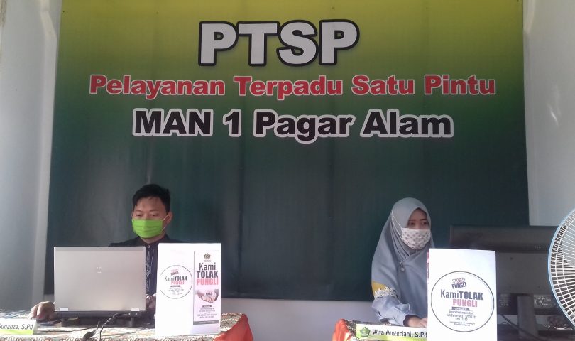 Jumat, (22/01) Pelayanan Terpadu Satu Pintu (PTSP) MAN 1 Pagaralam terus berinovasi dengan selalu meningkatkan pelayanan yang transparan, nyaman dan bersih bebas Pungutan Liar (Pungli). dan tetap waspada dan menolak pemberian uang saat atau selesai melayani tamu.