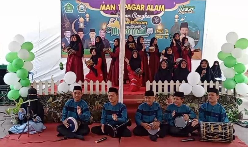Bertepatan tanggal 13 Rabiul Awal 1445H MAN 1 Pagar Alam menggelar acara Peringatan Maulid Nabi Muhammad Shalallaahu Alaihi Wassalaam Perayaan dilaksanakan dengan sederhana tapi syarat makna di tempat terbuka halaman tengah madrasah yang dihadiri oleh guru, pegawai dan seluruh siswa-siswi MAN 1 Pagar Alam, yang mengusung “Tema meneladani sifat Rasulullah Shalallaahu Alaihi Wassalaam dalam menciptakan generasi zaman now yang berakhlaqul Karimah menuju MAN 1 Mandiri dan Berprestasi” Sabtu (2/10)